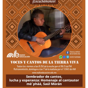En esta emisión de Voces y Cantos de la Tierra Viva rendimos un sentido homenaje al cantautor mè´phàà Saúl Morán, hijo del pueblo de Encino Roble, Malinaltepec, en la región de la Montaña de Guerrero. A través de su palabra y su música, Saúl sembró conciencia, memoria y resistencia, denunciando las injusticias, el abandono y el despojo que enfrentan los pueblos indígenas, al tiempo que celebró la vida comunitaria, la espiritualidad y la defensa del territorio.